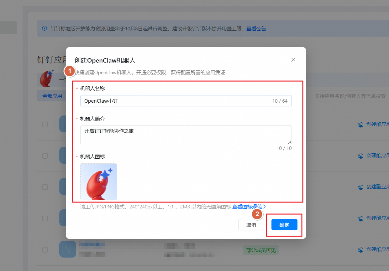 在创建OpenClaw界面,填写机器人基本信息(包括机器人名称、机器人简介和机器人图标),也可直接使用默认的机器人信息,直接点击确定即可。