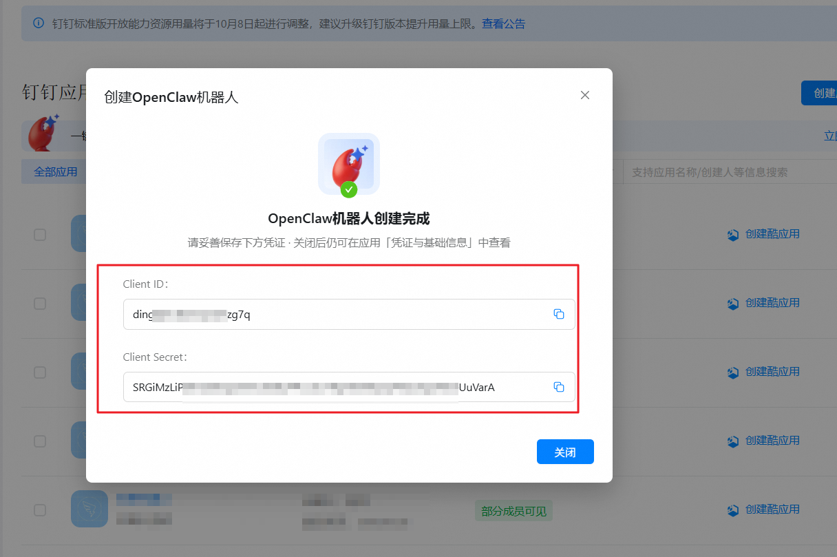 OpenClaw创建成功后,会自动展示应用的Client ID和Client Secret,请保存好Client ID和Client Secret用于后续使用。