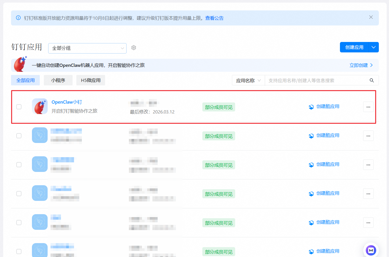 当OpenClaw创建成功后,会自动创建一个应用,如下图所示: