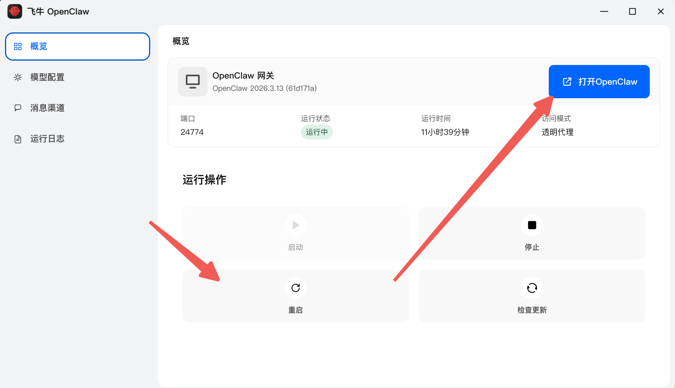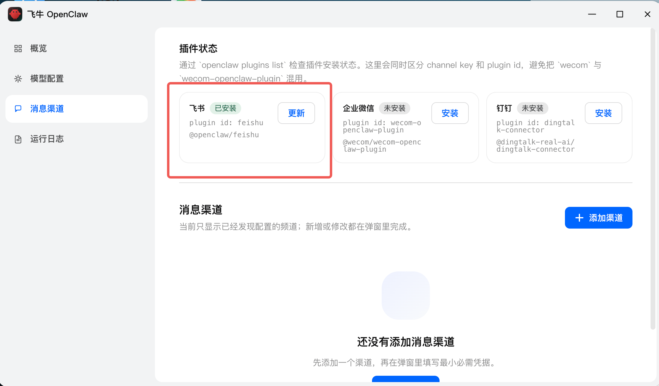 在消息渠道中配置 “添加渠道”,选择飞书,输入 App ID 与 App Secret,并保存