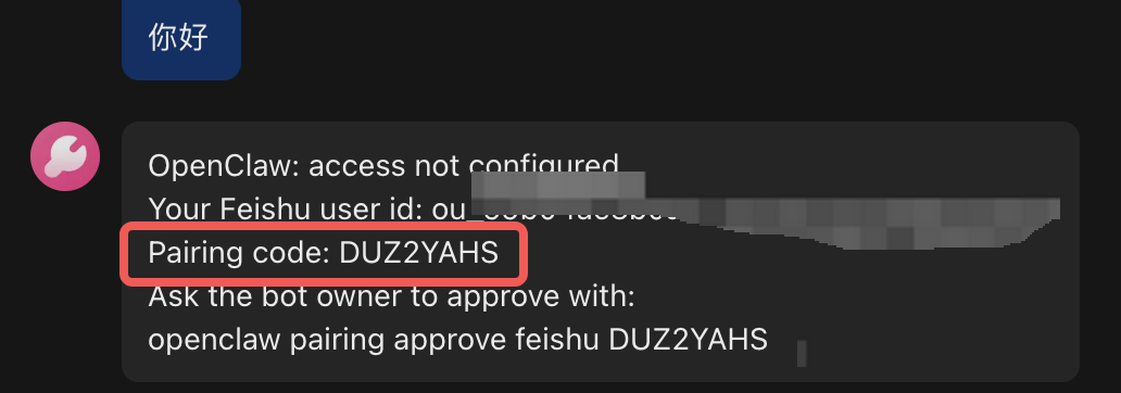 在飞书中找到你的机器人,进入私聊,发送任何消息,获得配对码