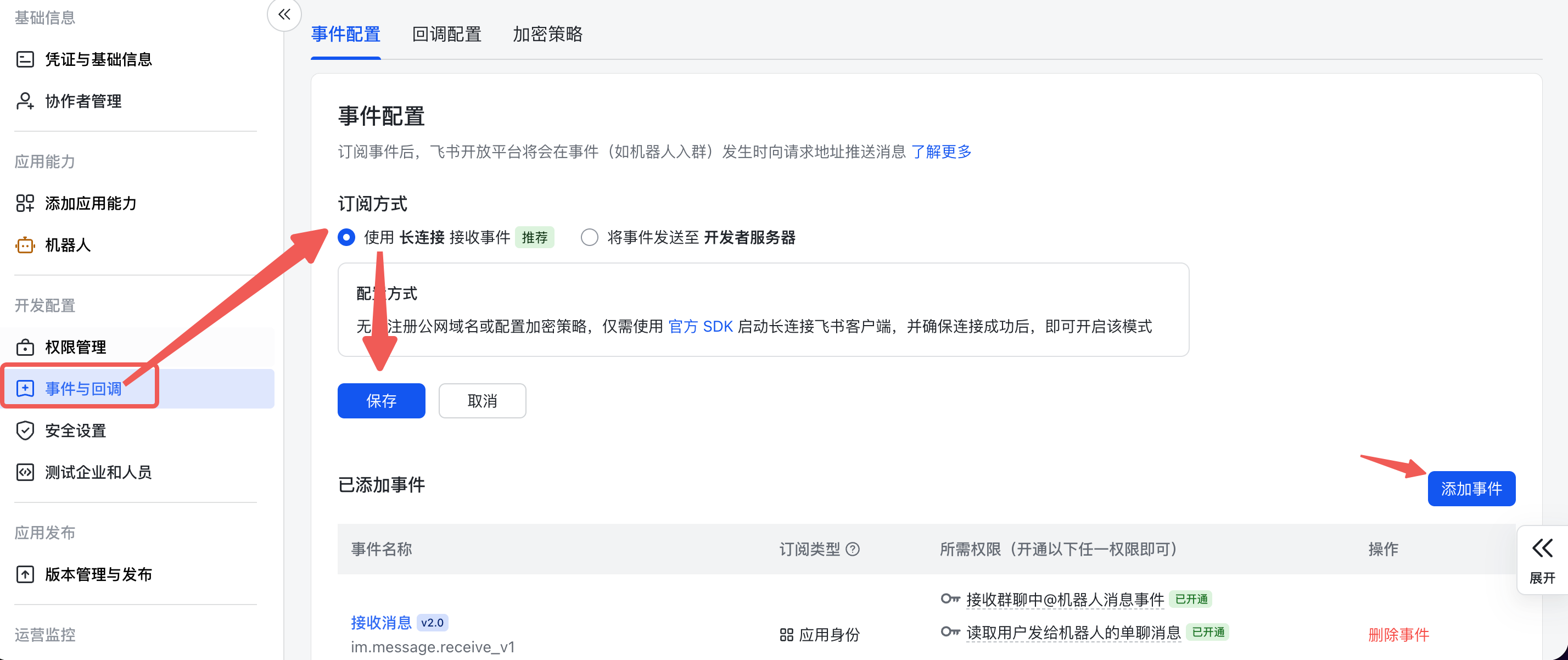 实测经验:如果还没先发布应用就直接开启"长连接订阅",通常会持续失败。