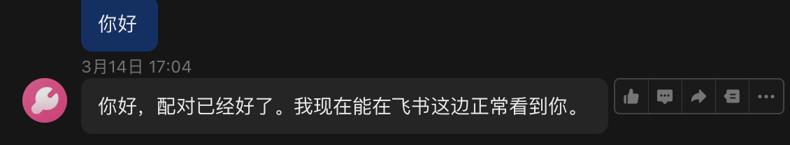 配对完成后,在飞书机器人中验证配对,只要机器人正常回复即可