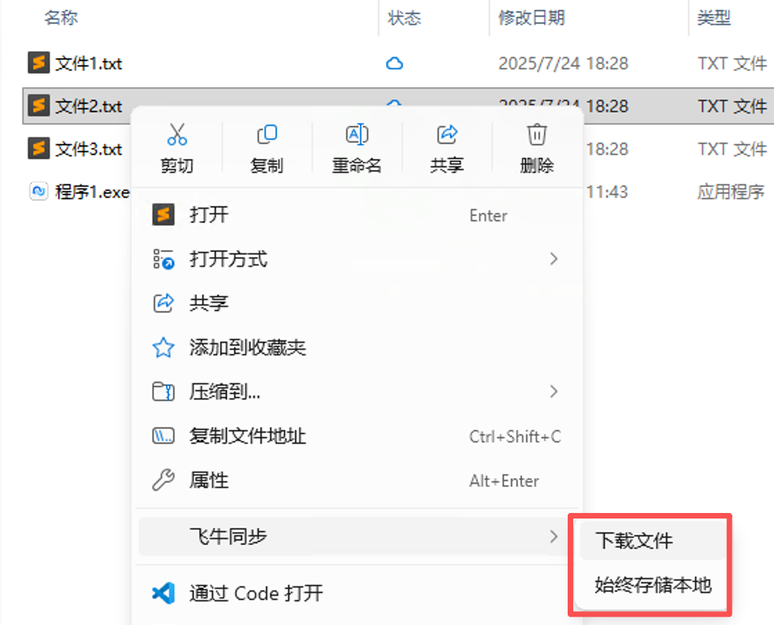 右键-飞牛同步-下载文件:系统会自动从 NAS 下载文件到本地