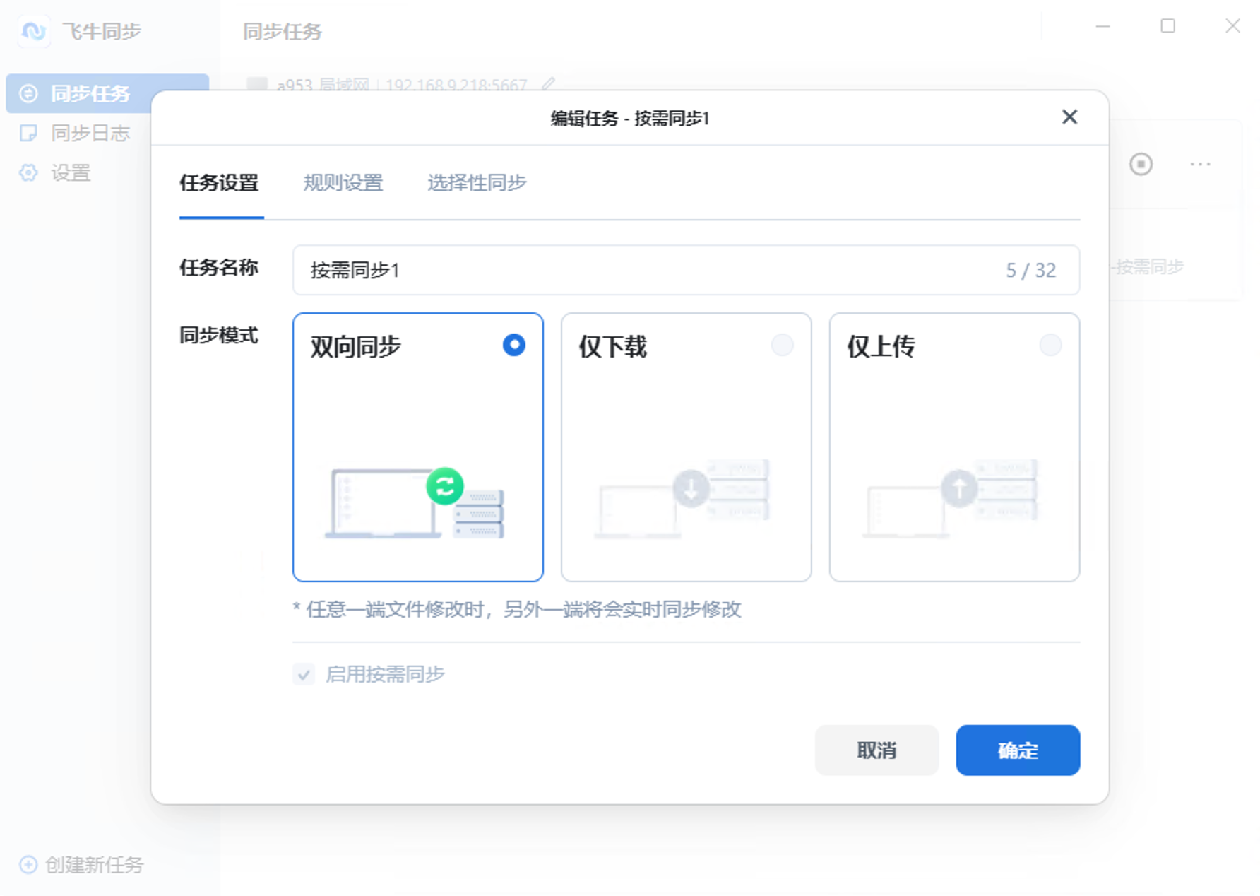 - 同步模式:不允许更改,仅上传和仅下载选项置灰
