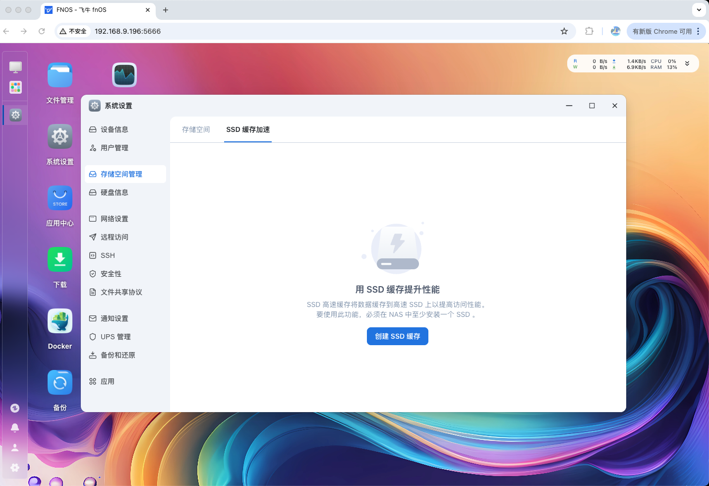 登录管理员账号,从桌面打开 系统设置 > 存储空间管理 > SSD 缓存加速 ,点击 创建SSD 缓存。