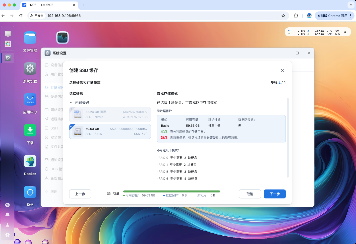 根据所选的硬盘个数,右侧将动态显示可供选择的存储模式。选择存储模式后,可以在弹窗底部确认缓存的预计容量情况。确认无误后,点击 下一步。