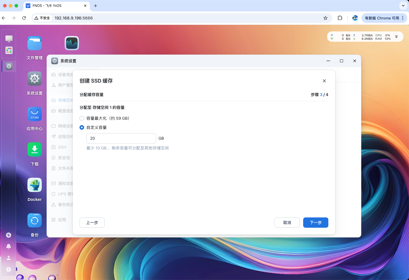 对于 Btrfs 和 ext4 的存储空间,可指定要分配给此存储空间的缓存容量,剩余容量可分配给其他存储空间。