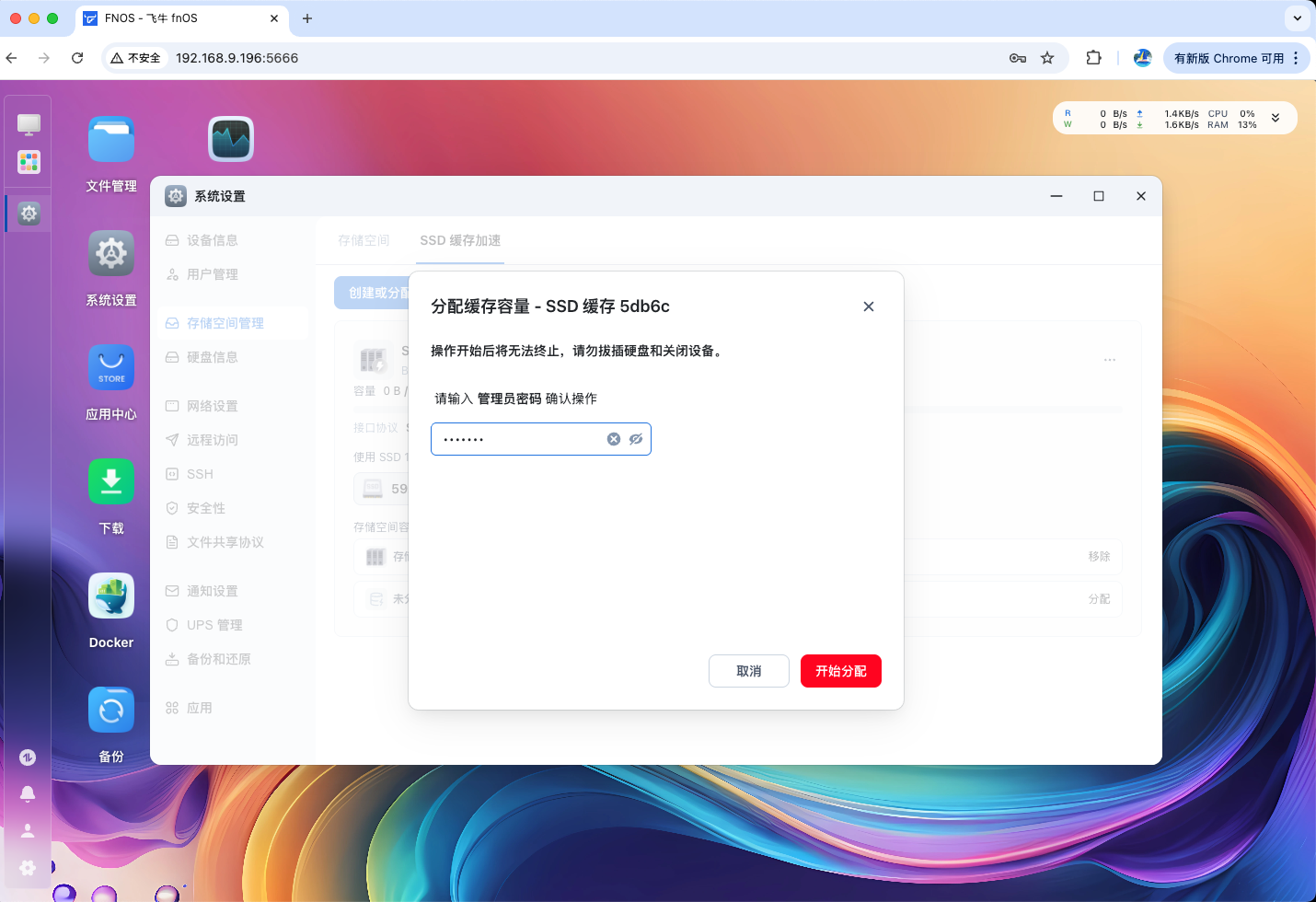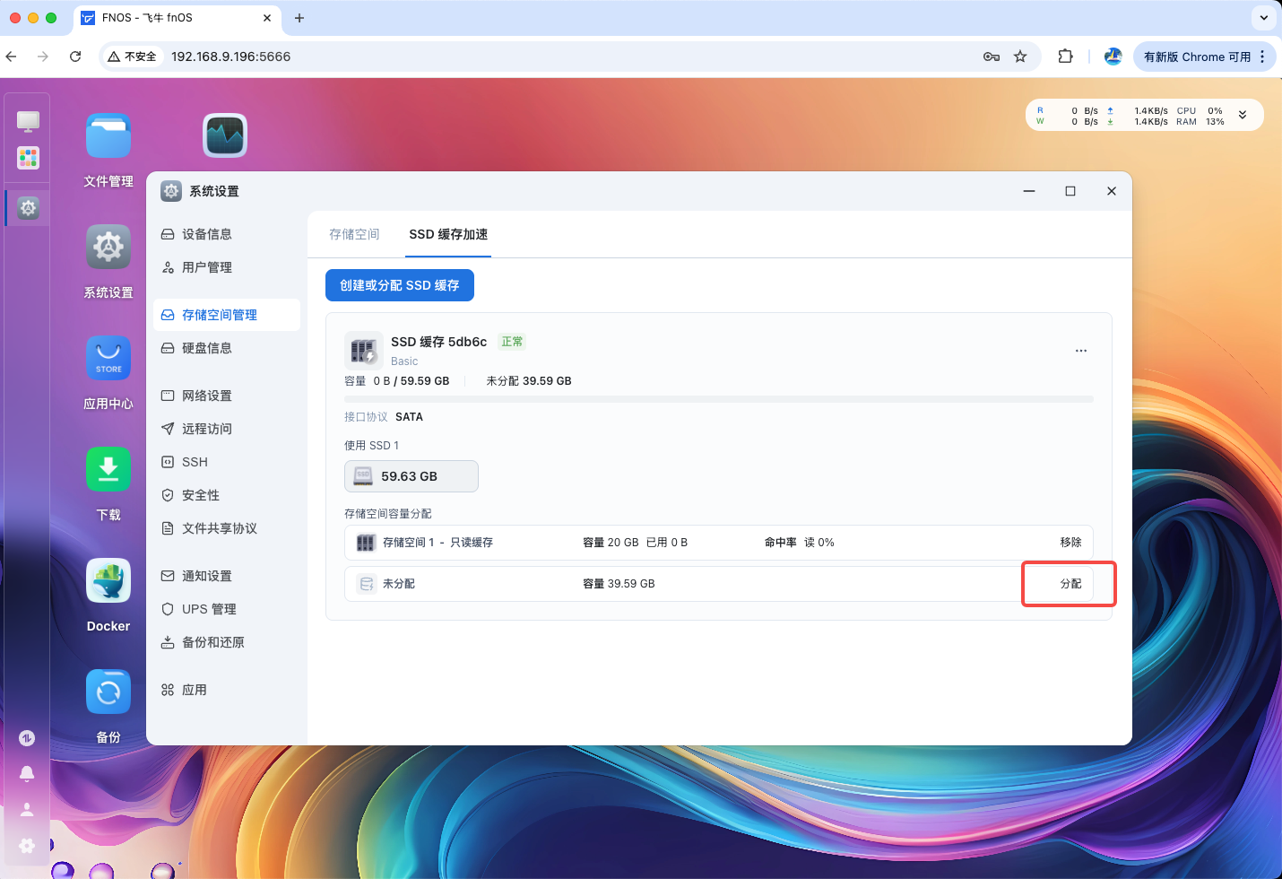 对于 Btrfs 和 ext4 的存储空间,多个存储空间可共用同个 SSD 缓存。当 SSD 缓存存在未分配的分区时,点击 分配,选择存储空间、缓存模式及分配容量,点击确认。