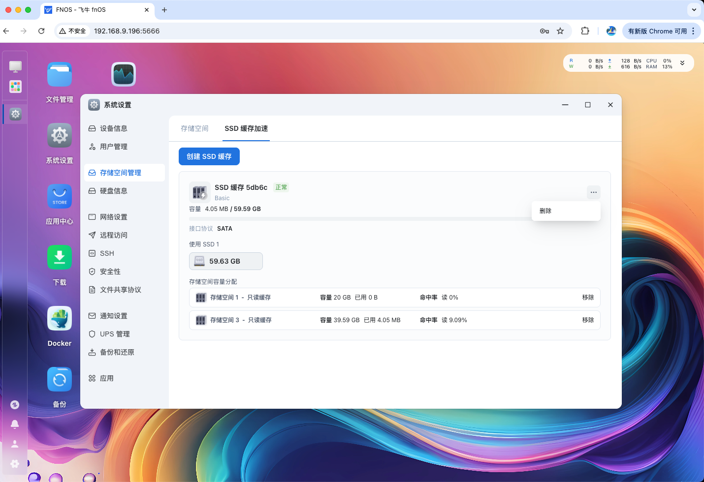 - 如果缓存的存储模式不具备数据保护能力(如 Basic、RAID 0),且选择了读写缓存(或 ZFS 的写入缓存)模式,则在 SSD 损坏、掉盘或非正常移除时,有较大概率导致数据丢失,请谨慎选择。